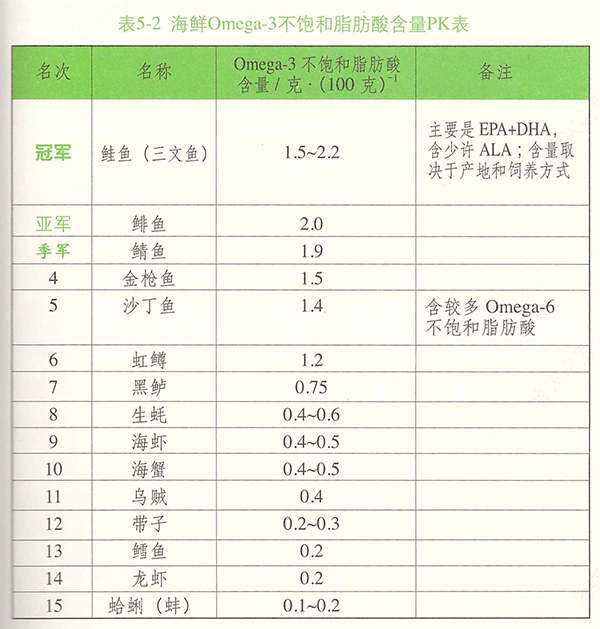海鮮主要補(bǔ)充EPA和DHA,且通常Omega-6不飽和脂肪酸含量較少(表5-2)。
